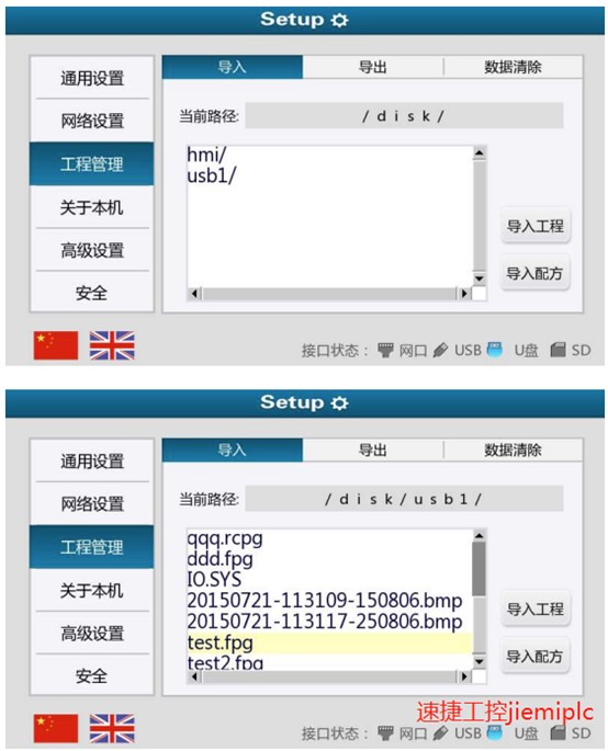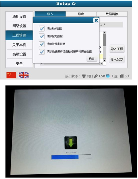 4.選擇 U 盤存放打包文件的路徑,使用“導入工程”選項,等待數據傳輸完畢即可,(百度一下速捷工控)